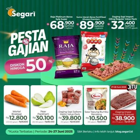 Segari menghadirkan promo Pesta Gajian dengan diskon hingga 50% untuk berbagai produk kebutuhan sehari-hari. Mulai dari Beras Premium, Daging Sapi Import, hingga Sayuran Segar, semua bisa Anda dapatkan dengan harga terbaik hanya pada 27-28 Juni 2025.